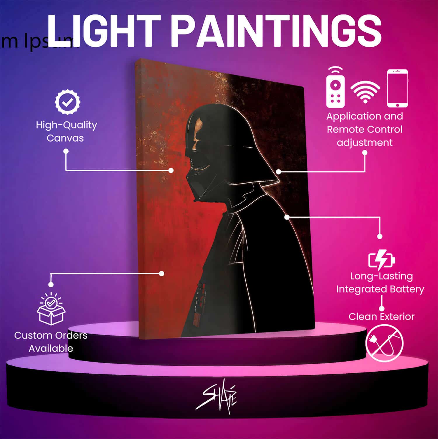 Unveil the power of the Dark Side in your own space with our exclusive Darth Vader oil-style portrait.But the true magic happens when night falls: the painting illuminates, highlighting Darth Vader and his lightsaber in a breathtaking display. A masterpiece that combines Star Wars universe with one of the kind lighted masterpiece of art.This is perfect for fans and collectors. Let the force of art be with you!