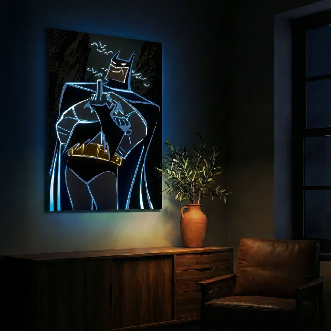 Justice… with attitude. This hilarious LED light painting shows the iconic caped crusader flipping the bird like a true antihero. By day, it’s cartoon-style chaos. By night, it glows in all the right places—from the belt to the bats, with that glorious finger illuminated for all to admire.