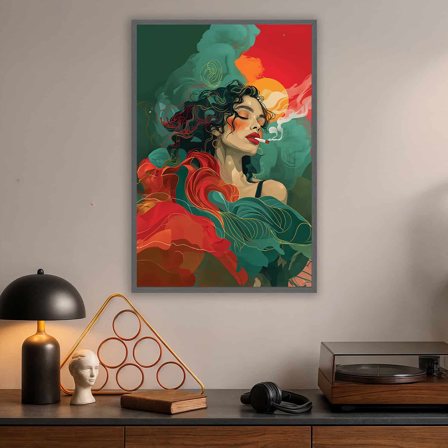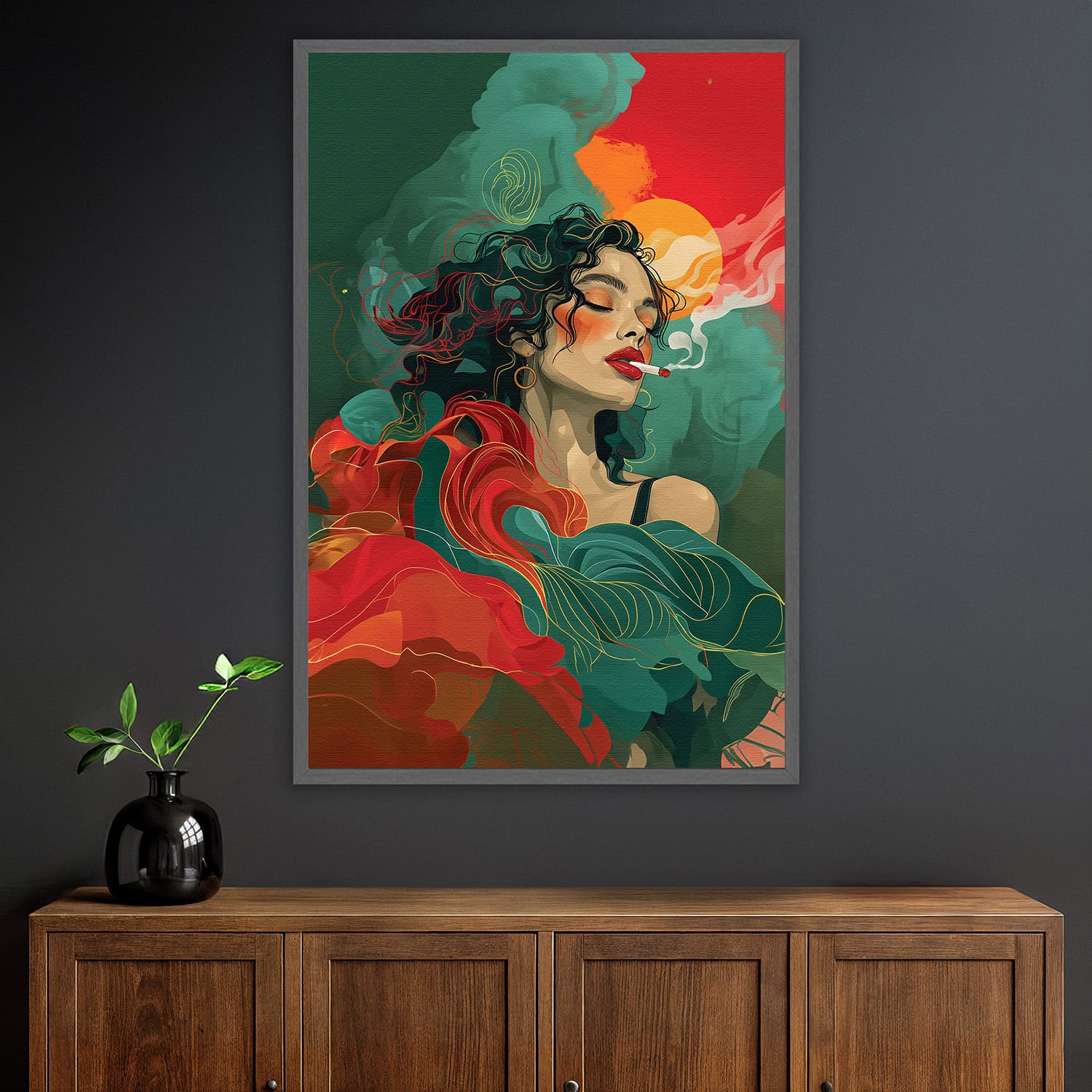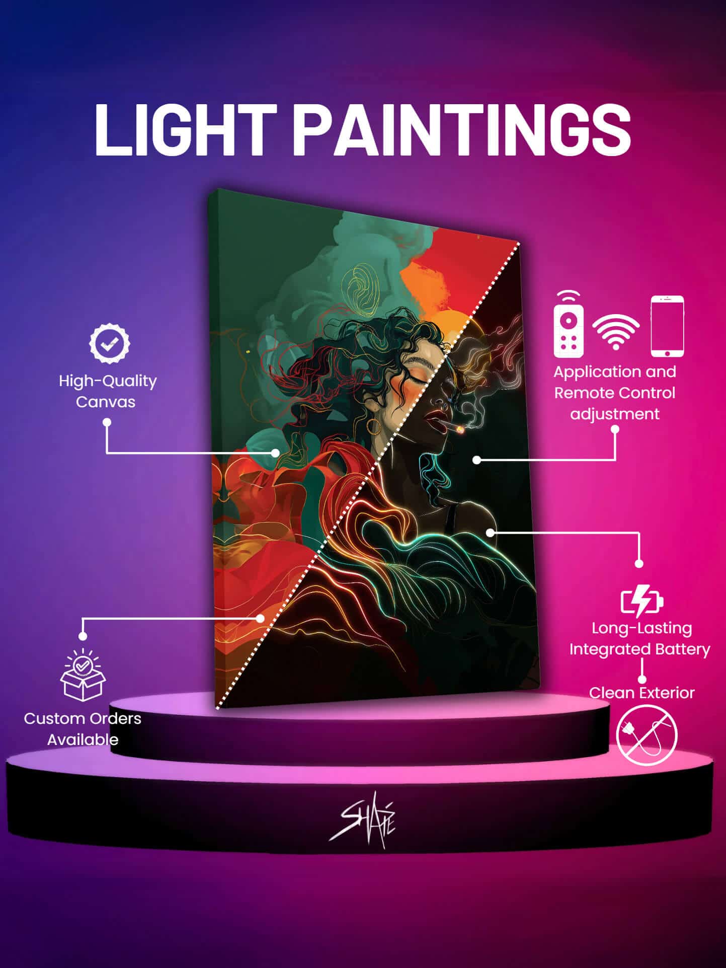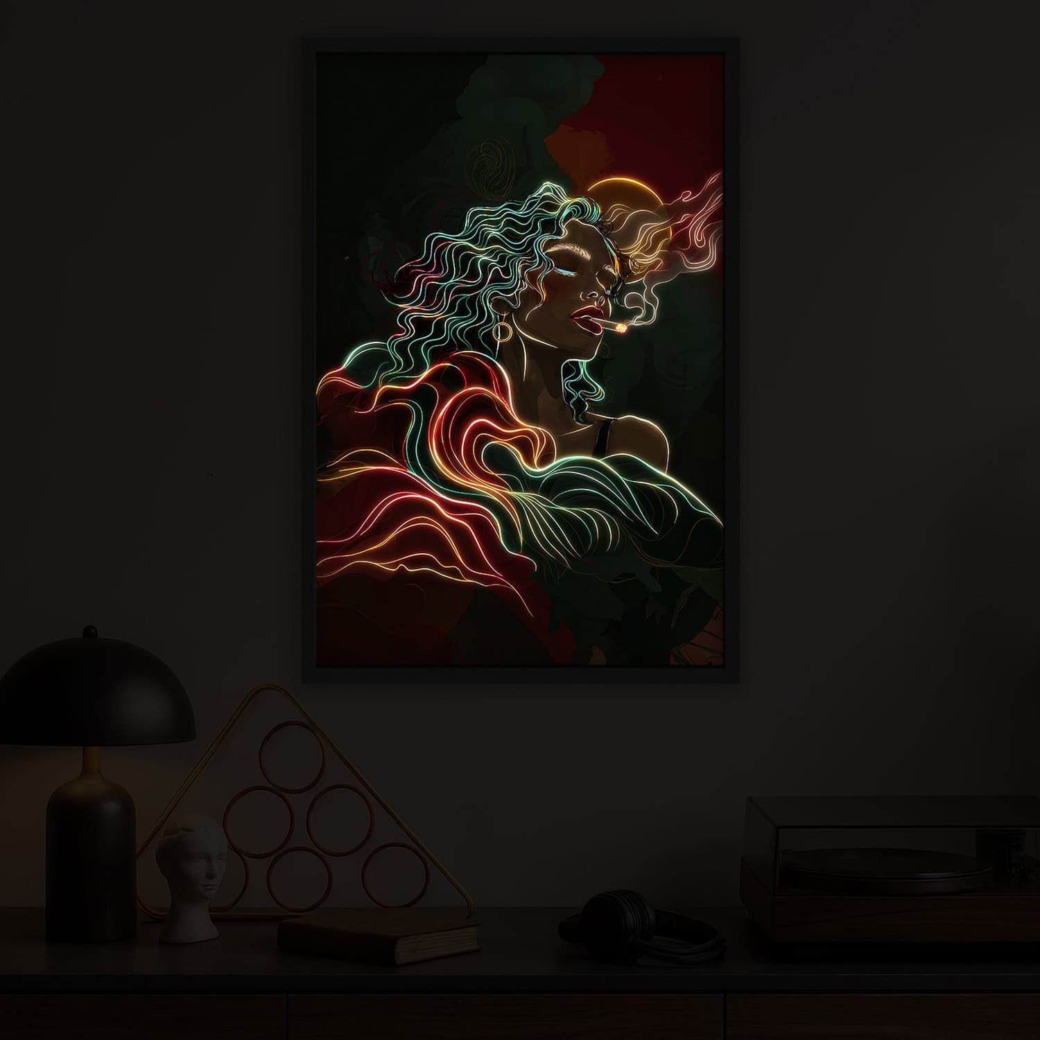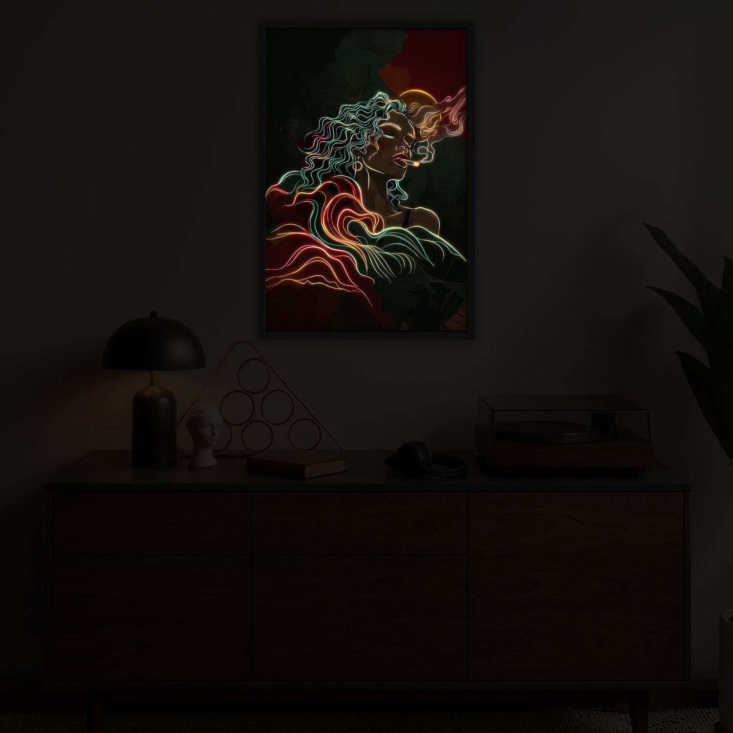 Illuminate your space with the essence of vibrant Latina spirit. Our exclusive LED light technology allows the wall art to come to life as darkness falls!At night, radiant lines trace her hair, face, and the wisps of smoke, creating a glowing masterpiece. Let it fill your home space with a touch of modern elegance and fiery charisma that can be enjoyed day and night.