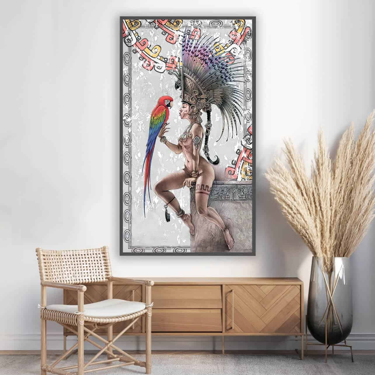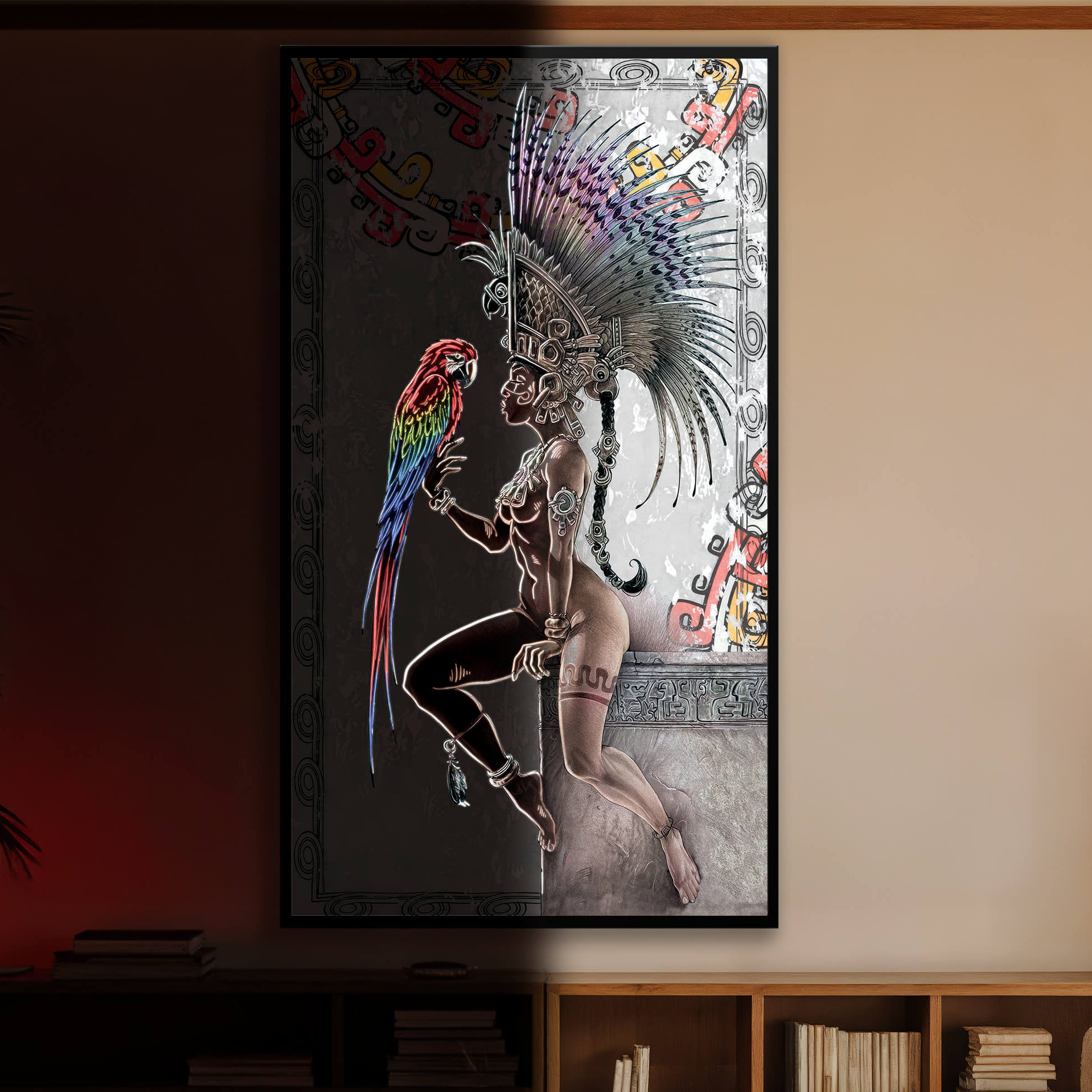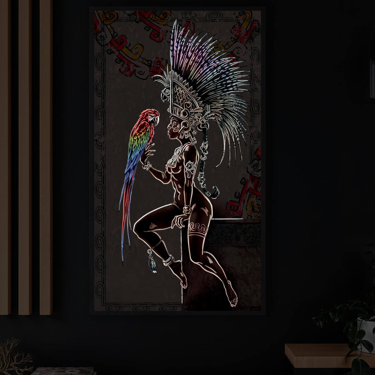 Artwork reveals an Aztec woman and her parrot—alive in daylight, glowing with mystical energy at night. Every detail is illuminated by a hidden, rechargeable light system that brings the artwork to life when darkness falls.