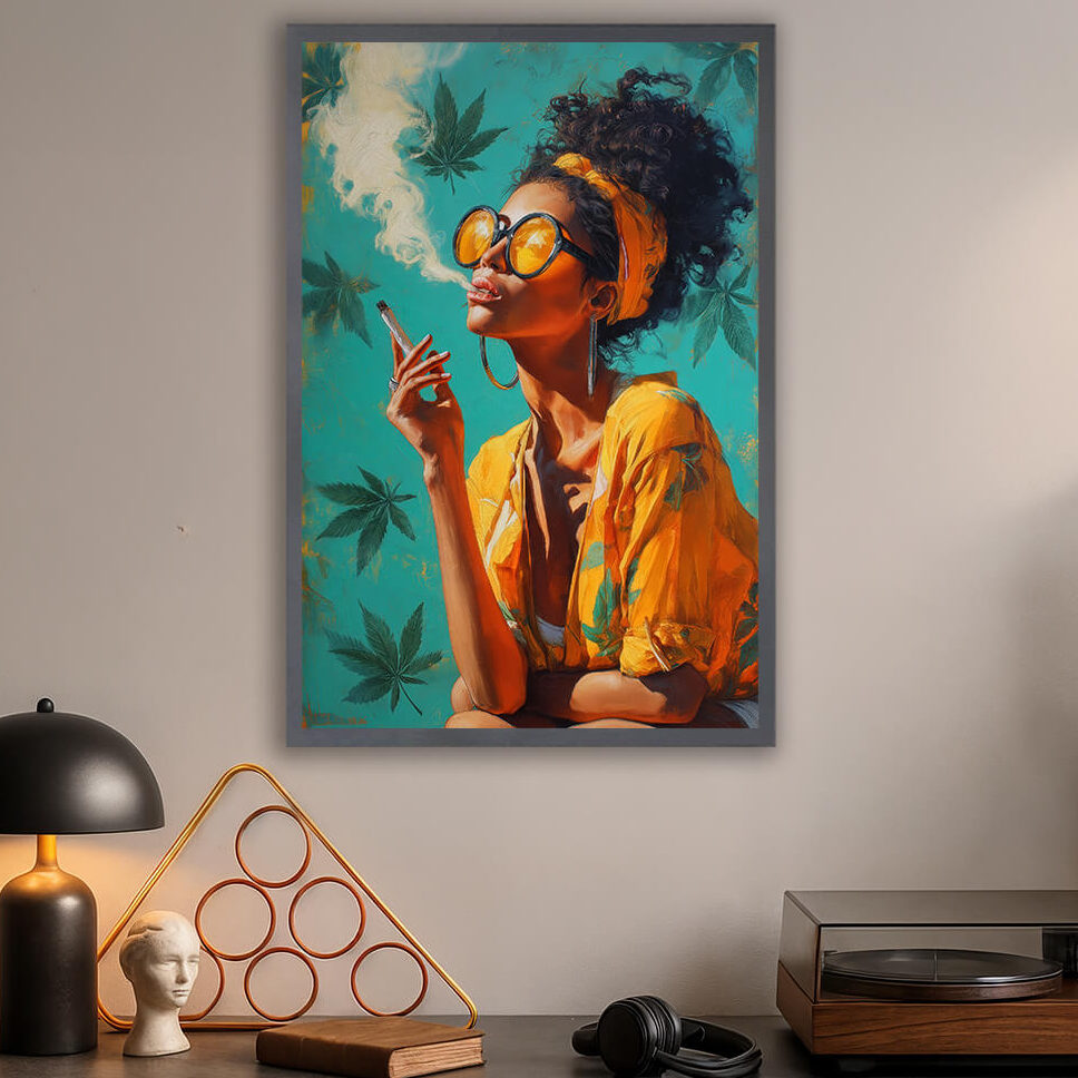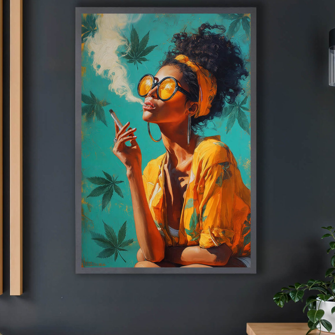 By night, the painting glows with soft LED outlines: the smoke, her glasses, and golden shirt come to life in the dark.