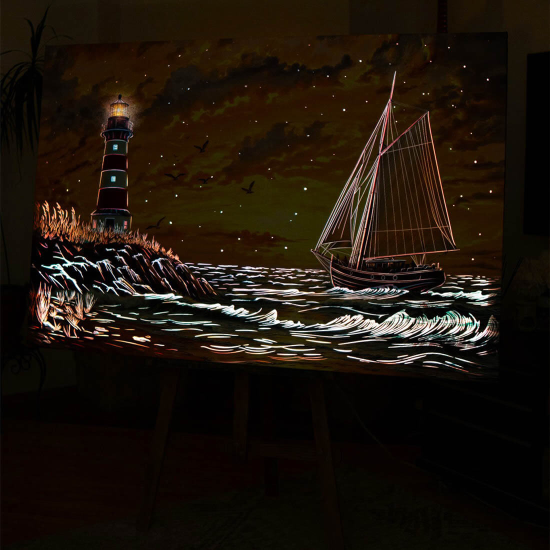But the true magic reveals itself at night: the sails, waves, stars, and beacon come to life through soft, glowing LED lines.