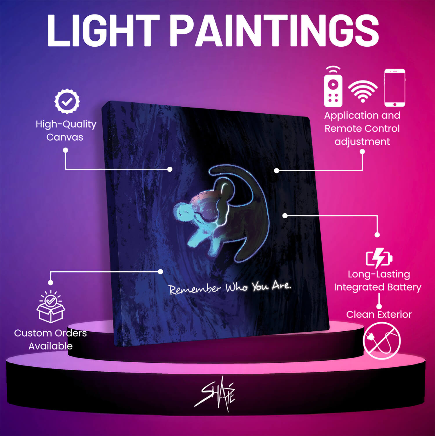 Every painting is carefully built with an integrated LED system that is wireless and smart—made to illuminate your space with subtle ambient magic.