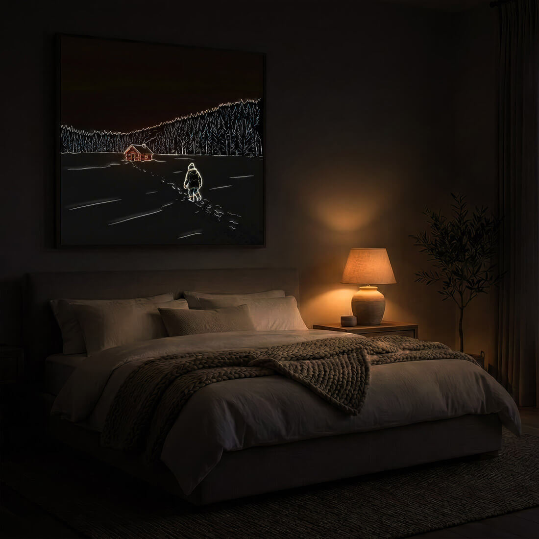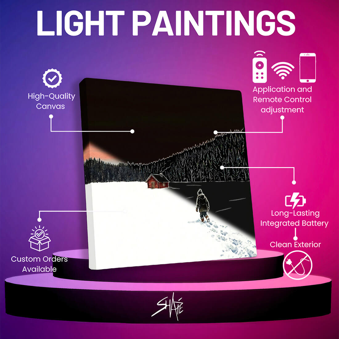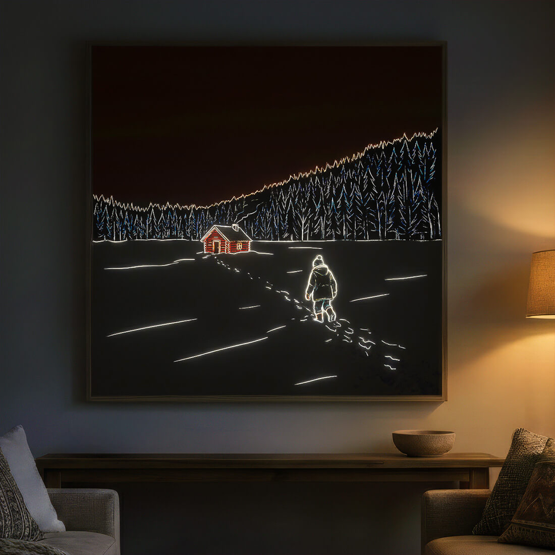 Every painting is carefully built with an integrated LED system that is wireless and smart—made to illuminate your space with subtle ambient magic.