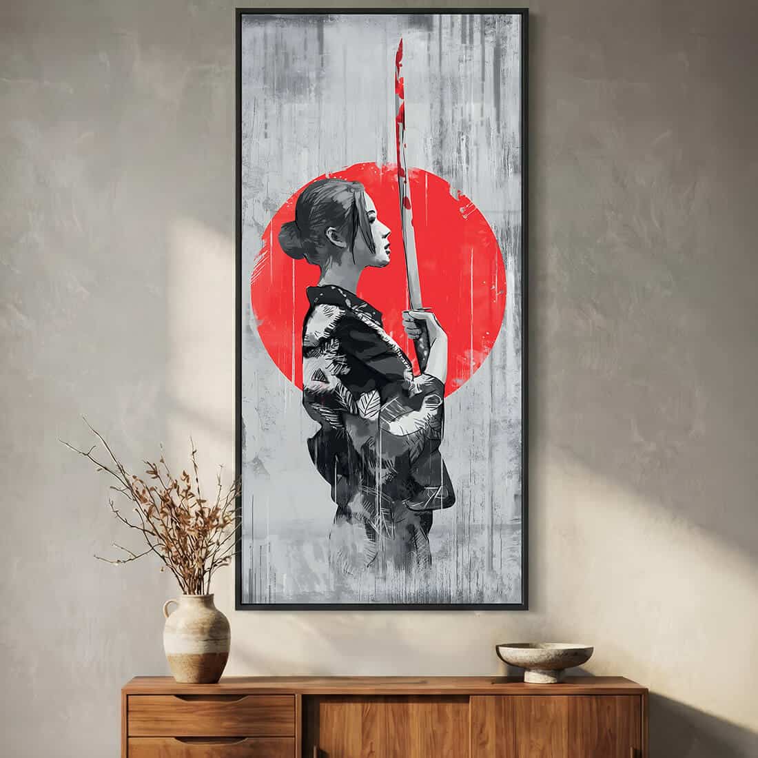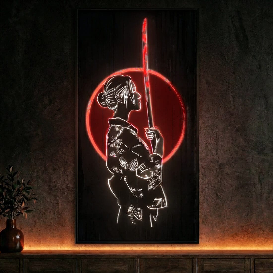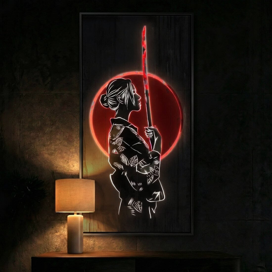 Her focus is sharper than the blade of a katana.Watch out! She will turn into a masterpiece in the dark and will take your whole attention.Japan art represents an image of a girl holding a katana blade with a beautiful, round red sunset in the background. Nighttime will highlight the delicate characteristics of her profile and body details, including her sharp blade katana and, of course, the outline of the red sun in the background. Everything together turns into a magical nighttime masterpiece after the sun is down.