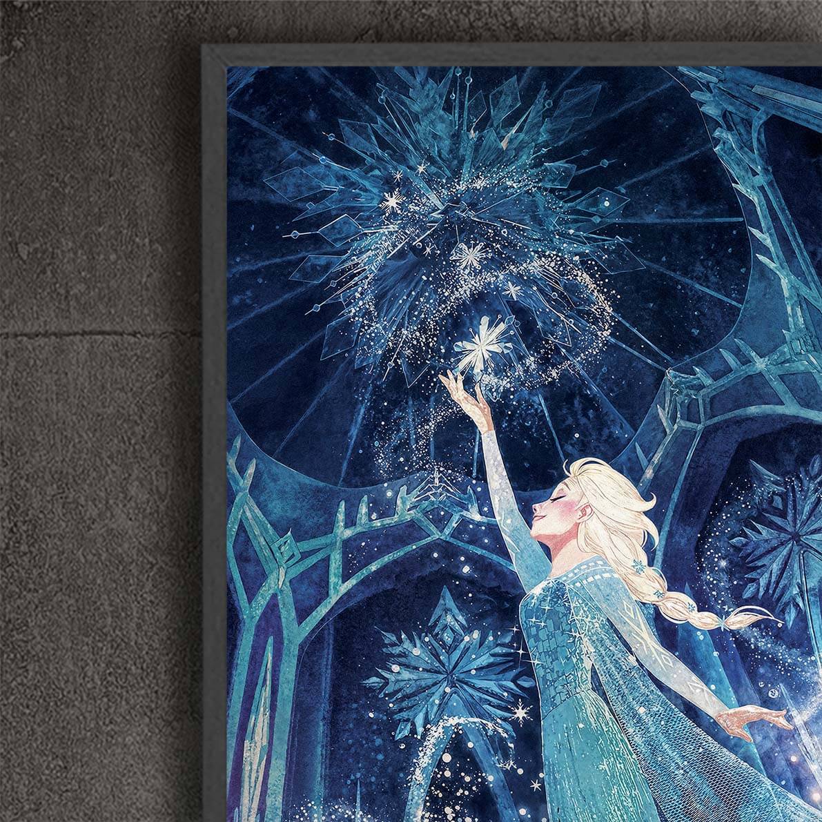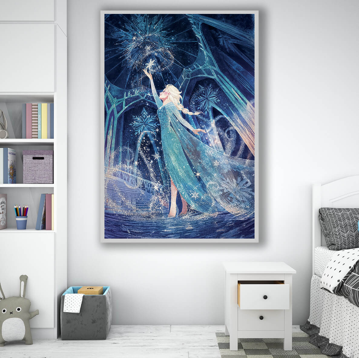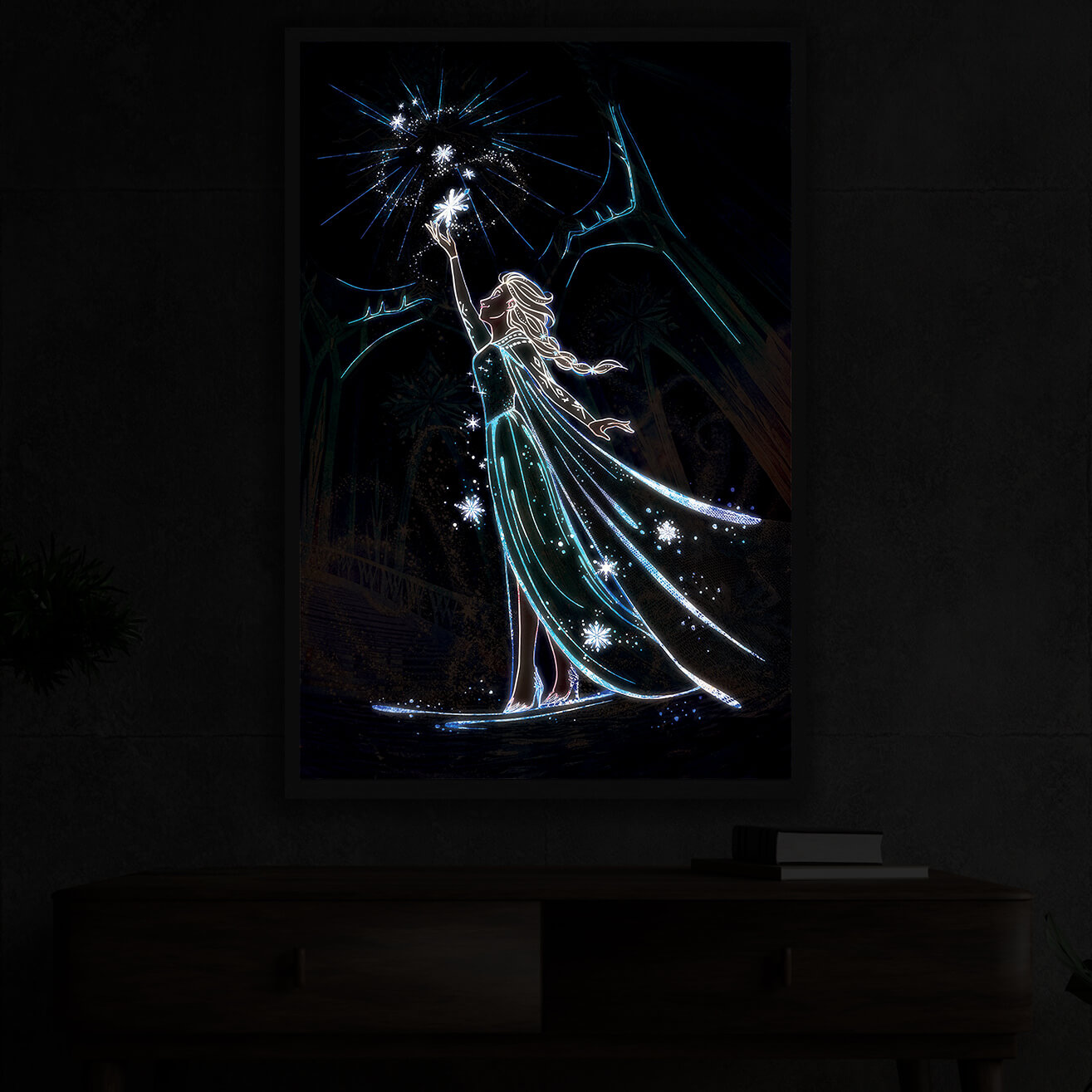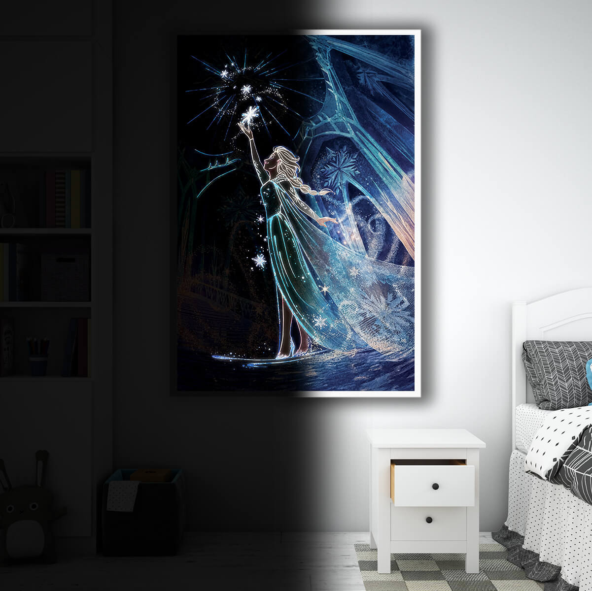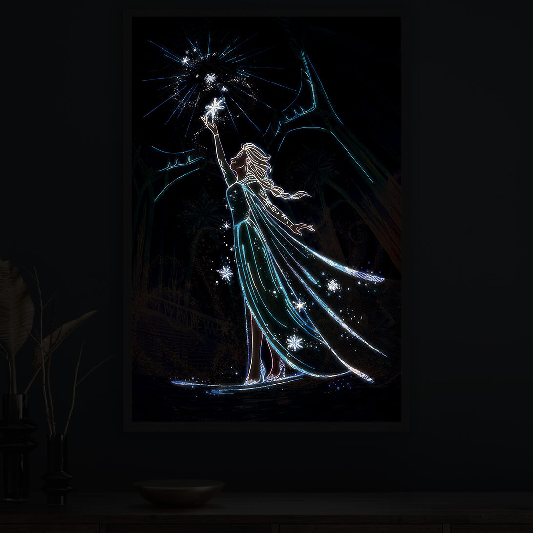 This beautiful lighted painting of a snow queen will change your or your kids room forever!Elsa is caught in an enticing panorama of snowfall, with snowflakes softly falling all around her. In the dark, the artwork comes to life, illuminating Elsa and the glittering snowflakes and transporting you and your family to a mystical winter paradise.A charming ambiance is a guarantee!